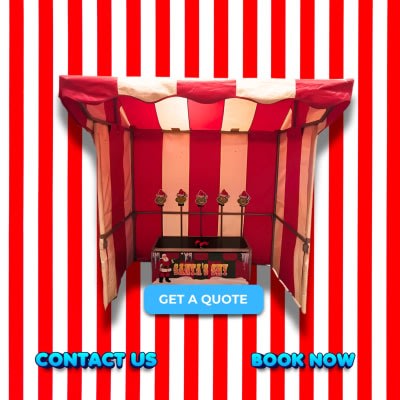 Indoor Christmas Santa coconut shy ideal for all Christmas functions. What a great attraction for your party at Christmas. Can be set up in your office or any function hall we have in stock red and white stripe stalls for hire.
