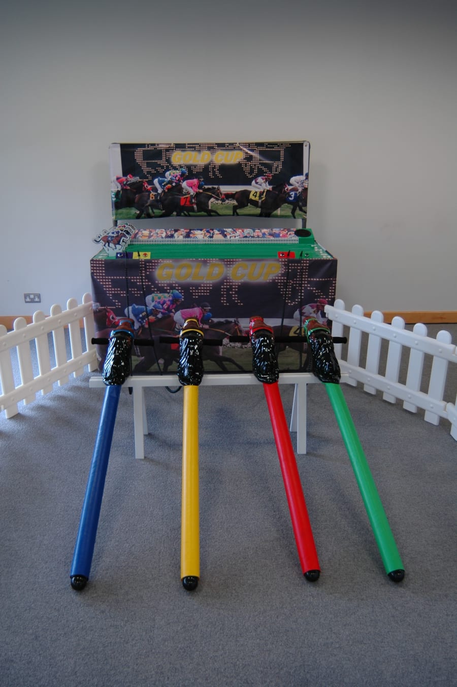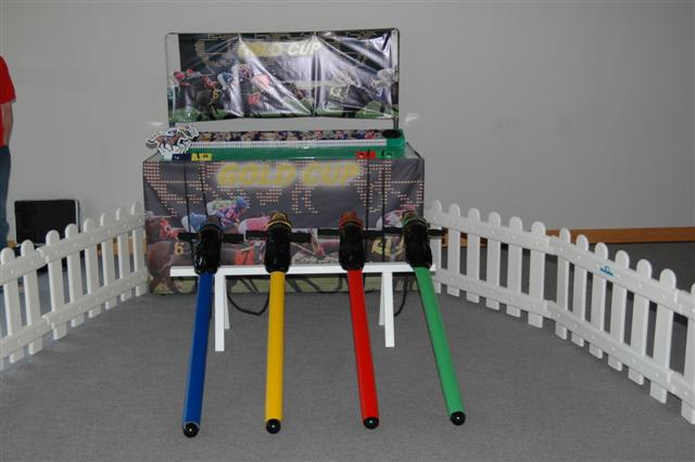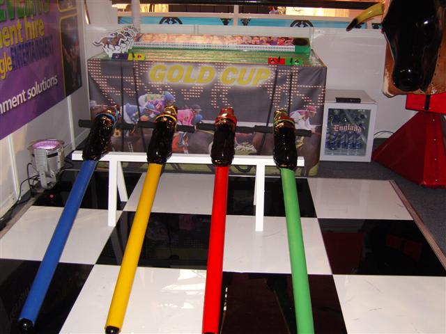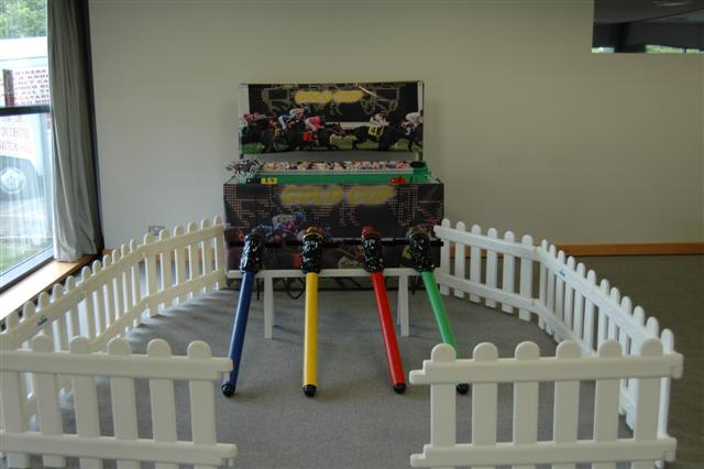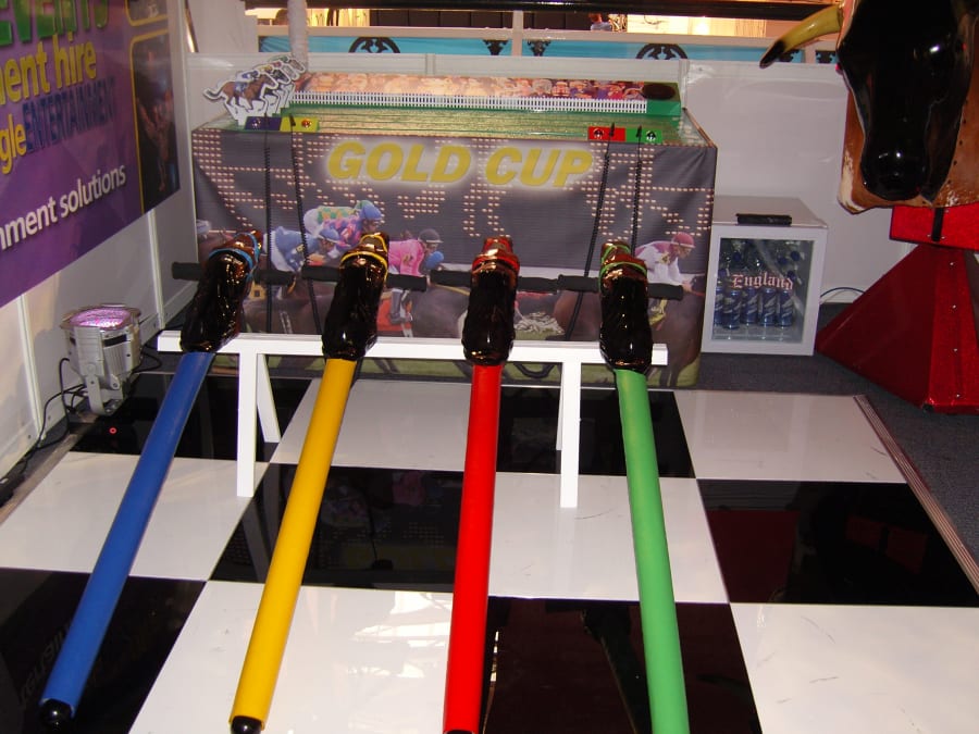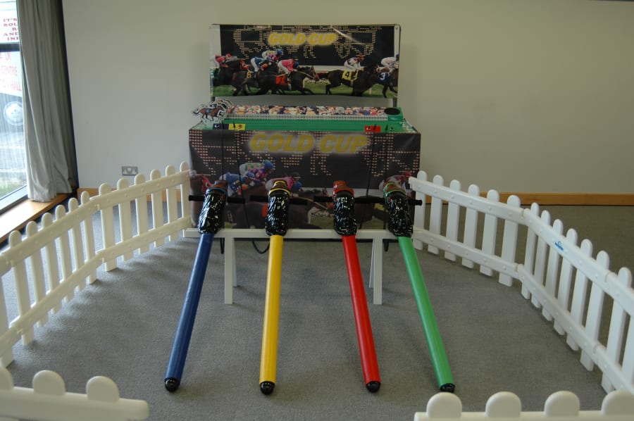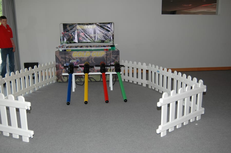 It’s a game for 4 players. The Horse Racing Simulator Hire There are 4 hobby horse's each being a different colour, red, blue, yellow & green. Each player has to put the hobby horse between their legs just above their knees, and hold onto the handles provided on either side of the horses head. Using the hobby horse, each rider has to simulate being a jockey on a horse using a circular motion, and the fast they do it the quicker their horse will move up the track to the finishing post. The game will be supplied with authentic race horse commentary which will add to the fun of the evening.