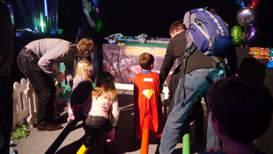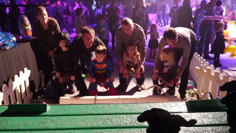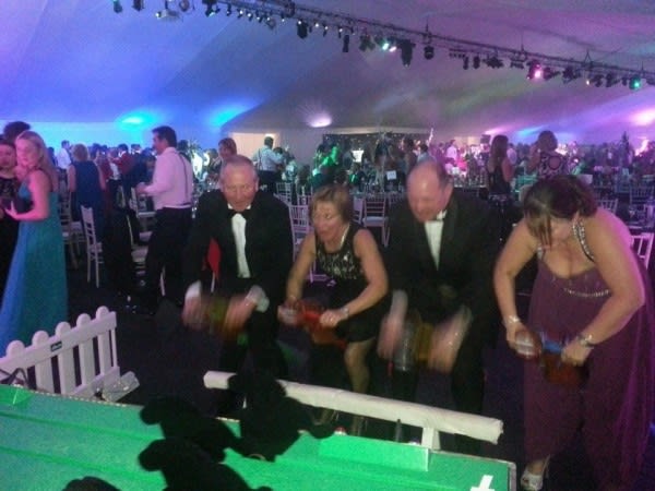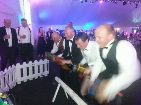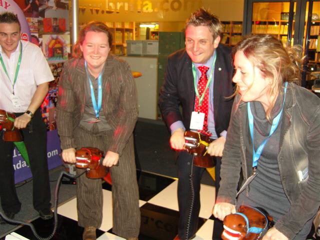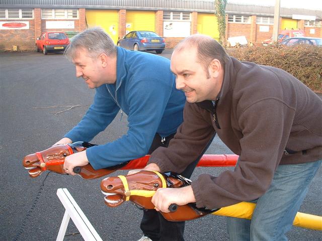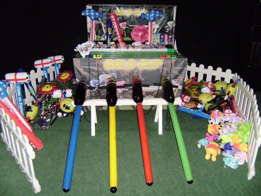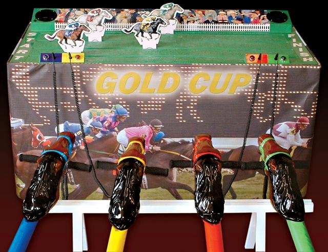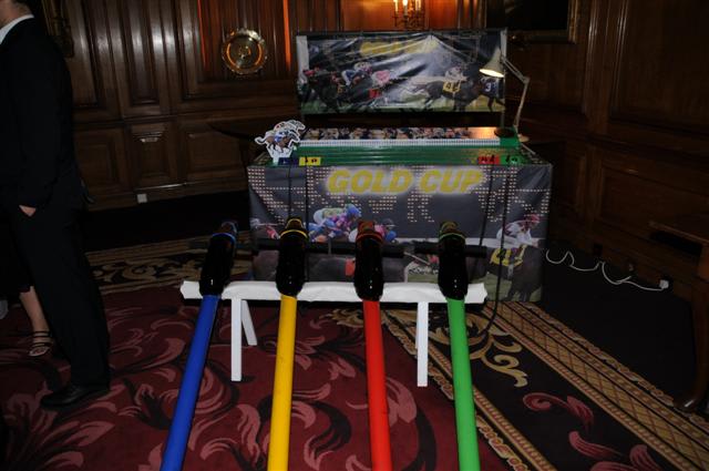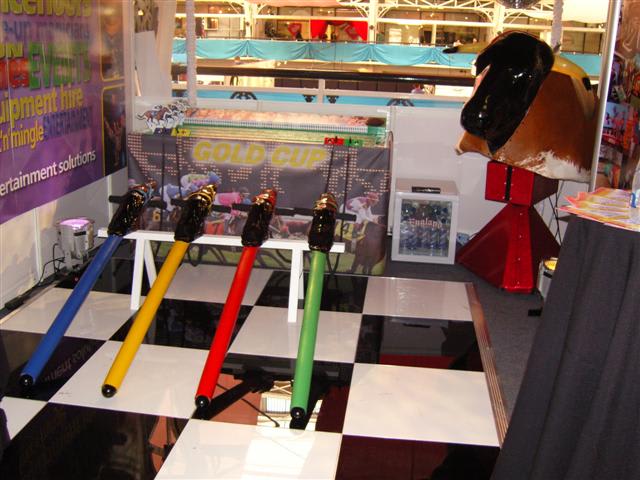 It’s a game for 4 players. The Horse Racing Simulator Hire There are 4 hobby horse's each being a different colour, red, blue, yellow & green. Each player has to put the hobby horse between their legs just above their knees, and hold onto the handles provided on either side of the horses head. Using the hobby horse, each rider has to simulate being a jockey on a horse using a circular motion, and the fast they do it the quicker their horse will move up the track to the finishing post. The game will be supplied with authentic race horse commentary which will add to the fun of the evening.